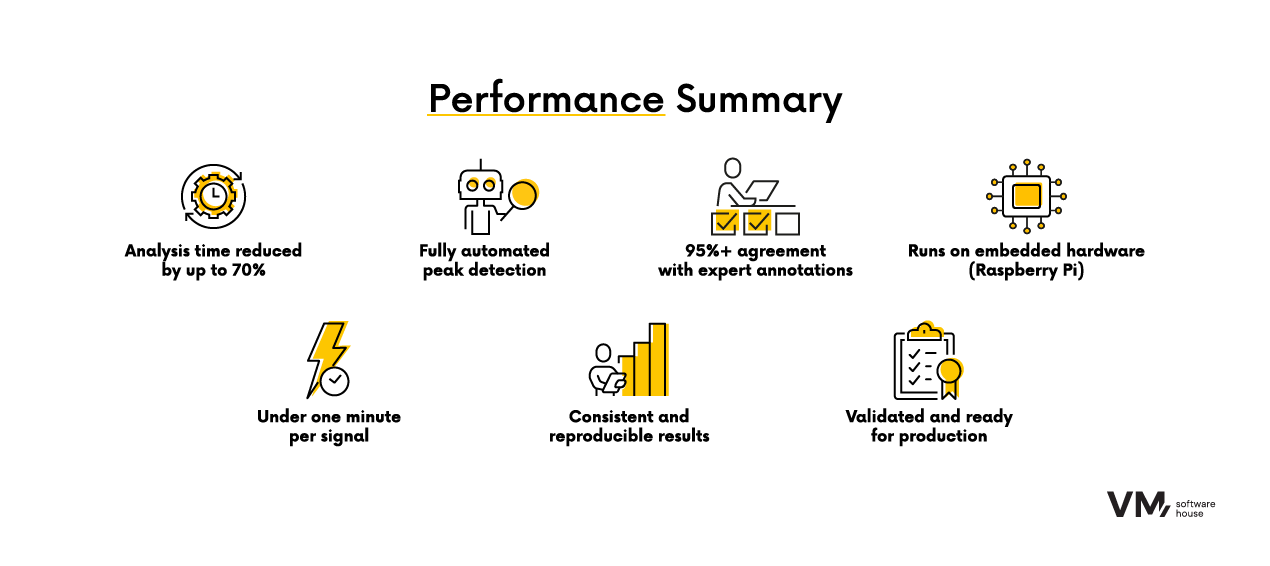 - Minimalne wymagania sprzętowe – wszystkie obliczenia wykonują się w czasie krótszym niż 60 sekund na sygnał na urządzeniu Raspberry Pi.