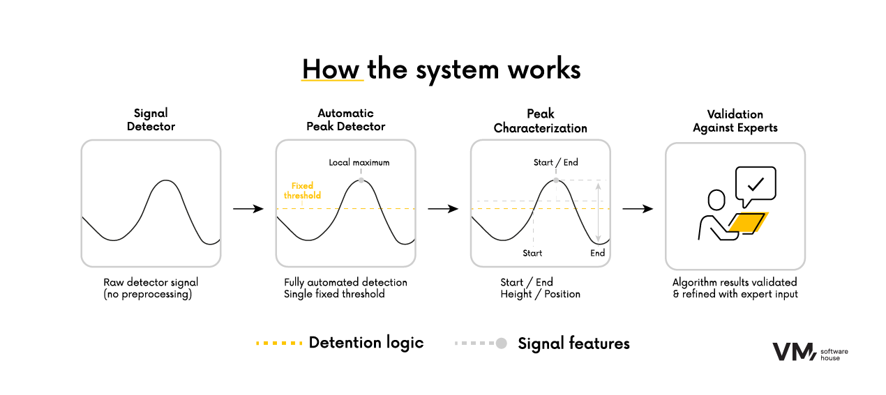 W jednym z projektów rozwojowych firma pracowała nad usprawnieniem procesu analizy sygnałów z urządzenia mierzącego zawartość azotu w próbkach materiałów stałych. Kluczowym problemem był etap detekcji pików — czyli momentów sygnału odpowiadających na przykład obecności azotu w badanej próbce.