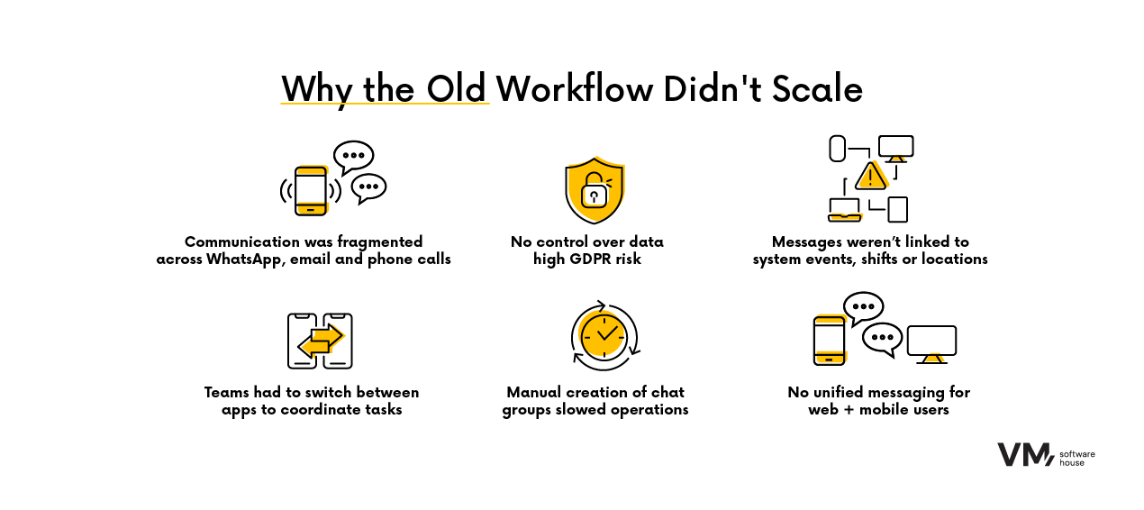 Cel: uproszczenie codziennej komunikacji między dyspozytorami, kierownikami obiektów i pracownikami – bez użycia zewnętrznych narzędzi, takich jak WhatsApp – z pełnym zapewnieniem zgodności z RODO.