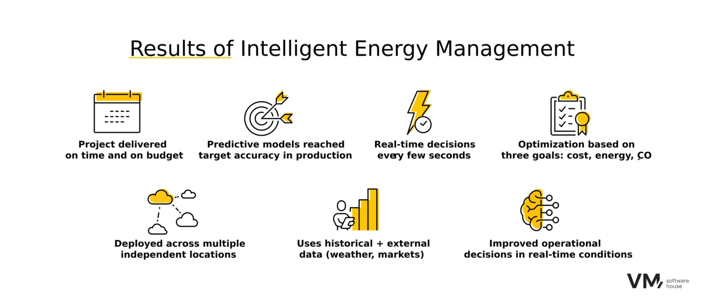 - System znacząco usprawnił podejmowanie decyzji w czasie rzeczywistym, umożliwiając klientowi dynamiczną reakcję na zmieniające się ceny energii, warunki pogodowe oraz profile zużycia.