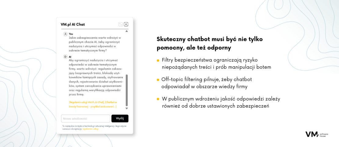 Zabezpieczenie chatbota to kluczowy element każdego wdrożenia AI. Nie ma jednego uniwersalnego zestawu reguł – każdy chatbot wymaga indywidualnego podejścia, dostosowanego do jego funkcji, branży i grupy docelowej. Bot wspierający klientów zewnętrznych musi mieć inne filtry niż wewnętrzny asystent dla pracowników IT.